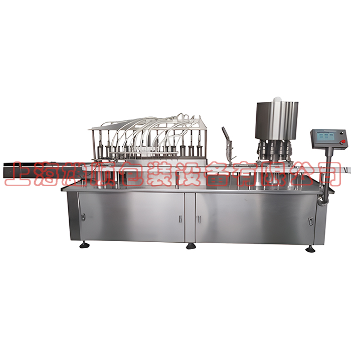 本机集液体灌装、上塞、旋盖(扎盖)功能于一体,能自动完成灌装、理塞、上塞、理盖、上盖、旋盖、出瓶等工序。整机运行流畅,性能稳定,计量精度高,符合GMP要求。